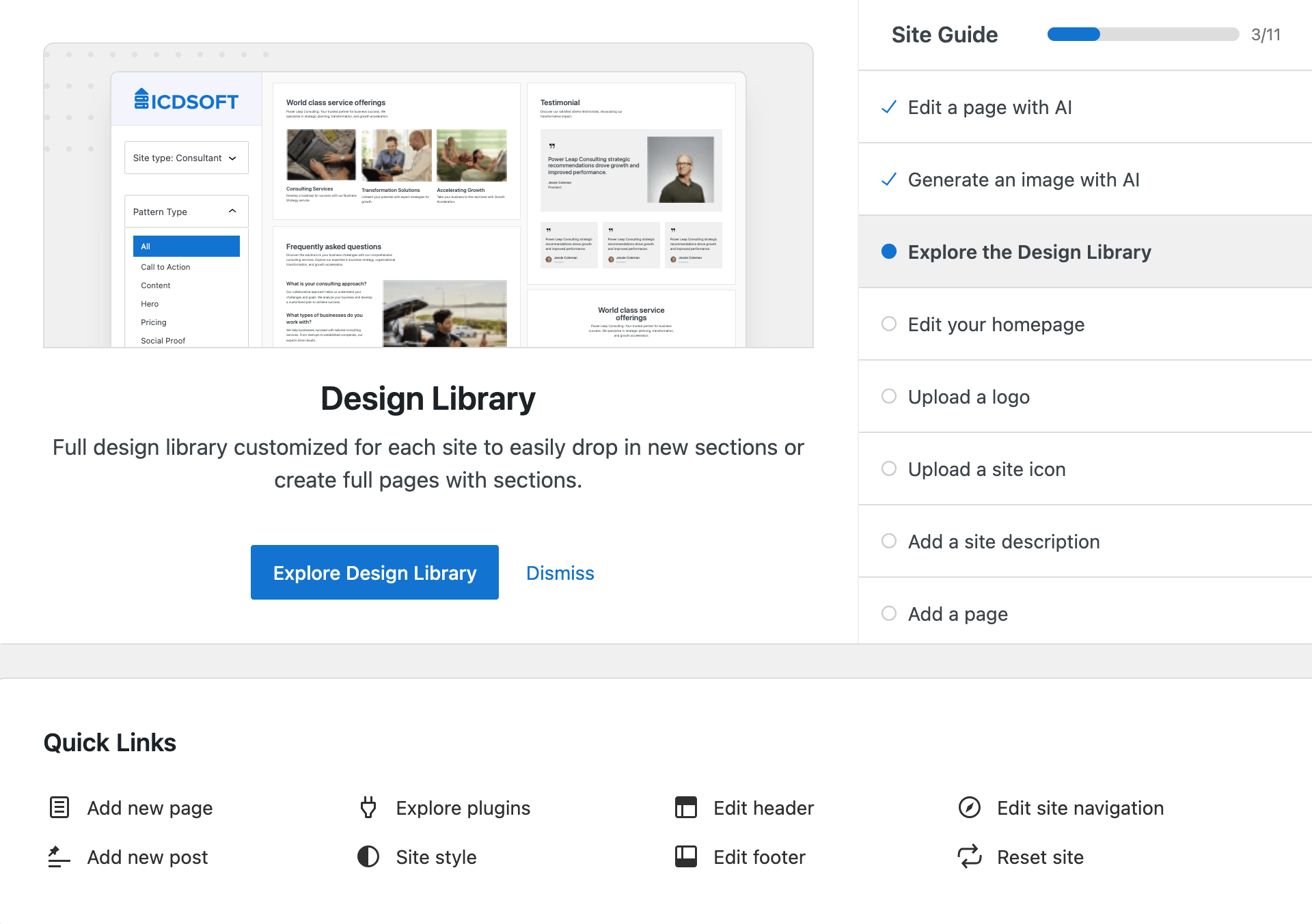Launch your WordPress site in minutes with our fully integrated AI assistant. From the very first click, you'll get smart content suggestions, intuitive setup guidance, and automated tools that help you build and manage your website faster - all in one streamlined experience.
